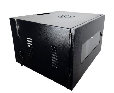 Gabinete compacto diseñado para montaje en pared, con capacidad de 6 unidades de rack (6RU), ideal para alojar equipos de redes, telecomunicaciones o seguridad en espacios reducidos.
