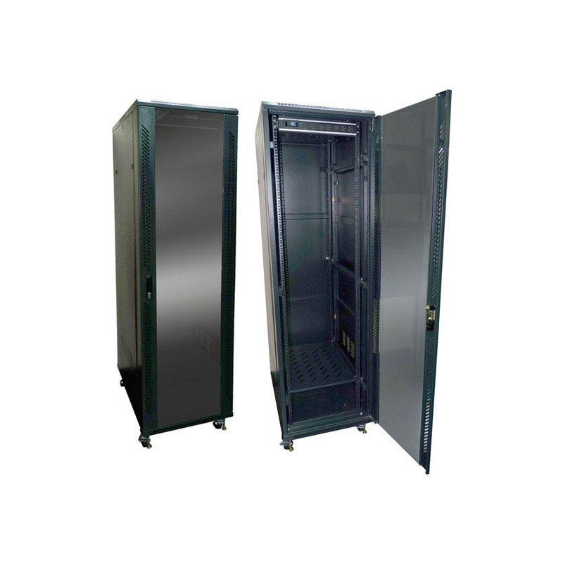 Gabinete robusto de montaje en piso con capacidad de 42 unidades de rack (42RU), fabricado en acero para brindar seguridad y organización a equipos de redes, servidores y telecomunicaciones en centros de datos o salas técnicas.